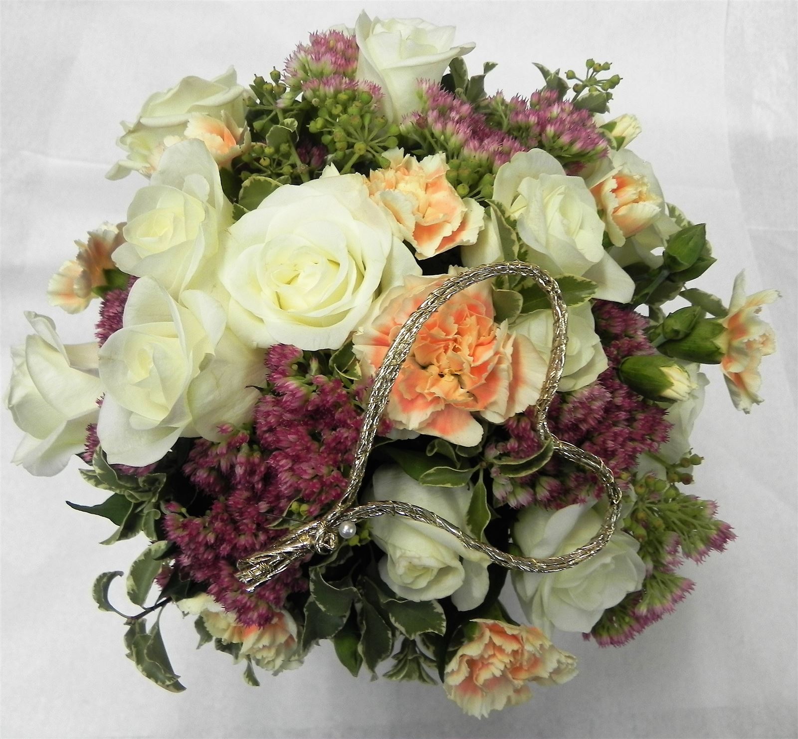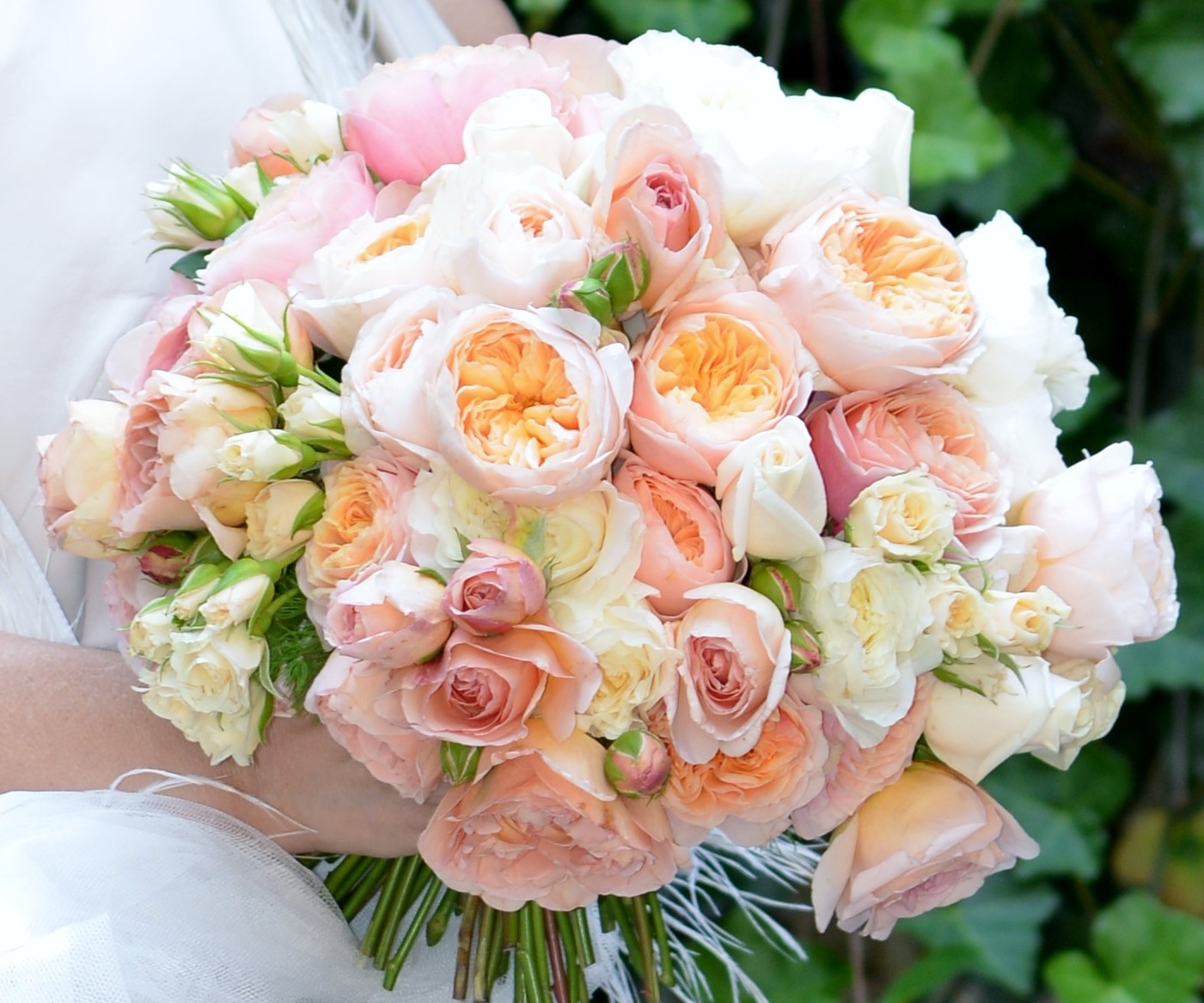 Un particolare del bouquet di rose e altri fiori nei toni chiari. Un'idea regalo semplice ma di grande effetto
