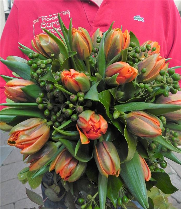 Bouqut di tulipani verdi-arancio con bacche verdi